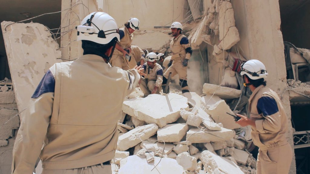 Los Cascos Blancos están vinculados a grupos terroristas como el Frente al Nusra. Los activistas de la organización se muestran a sí mismos como rescatando a gente de debajo de los escombros y proporcionando primeros auxilios. Sin embargo, varios vídeos han aparecido en los medios que muestran que tales operaciones son falsas y preparadas para ser filmadas. Las víctimas son maquilladas y se les da instrucciones sobre lo que deben decir. En algunos vídeos los activistas de los Cascos Blancos aparecen en uniforme y portando armas.