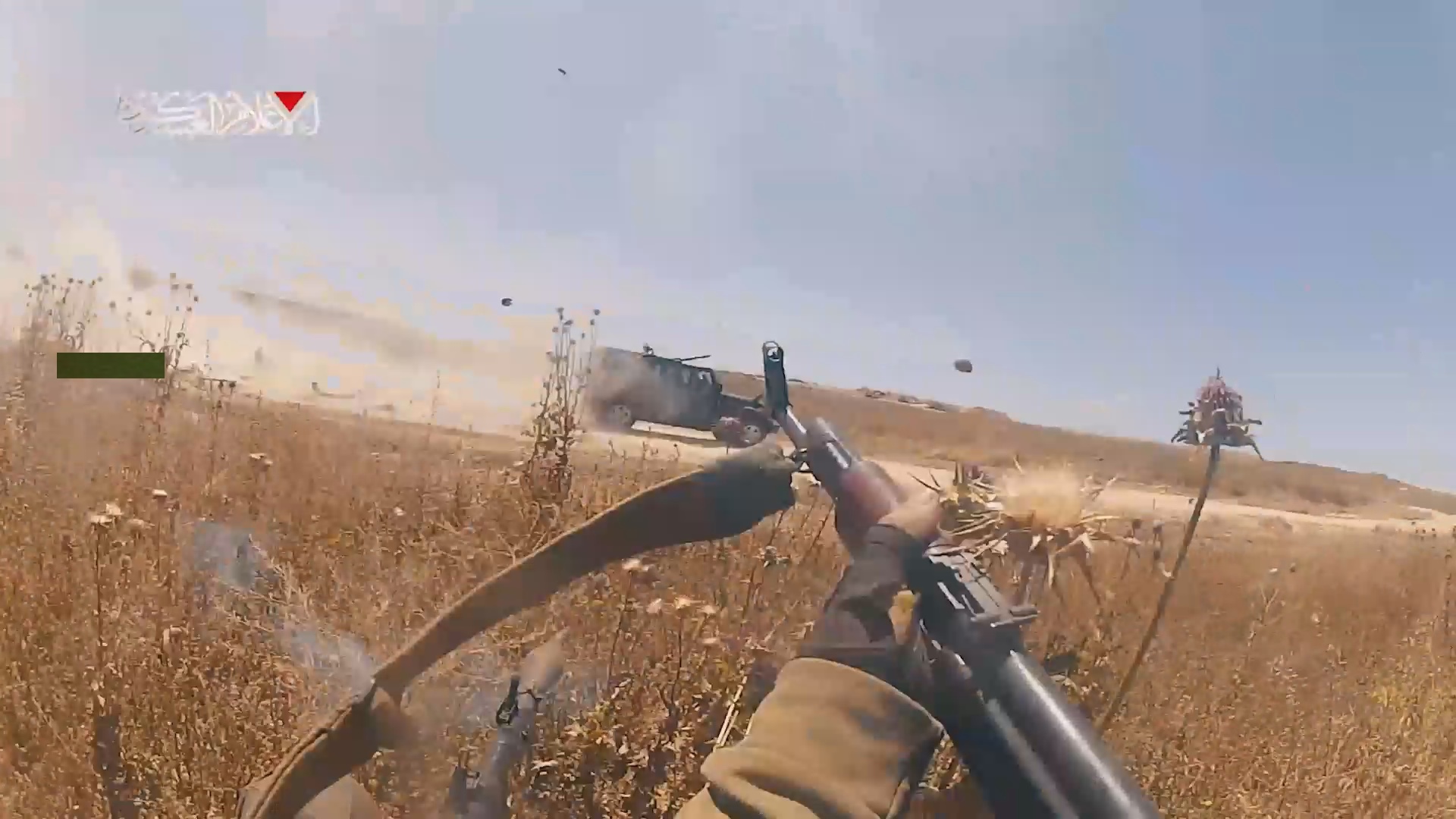 El vídeo muestra cómo los combatientes de Al-Qassam dispararon un proyectil y munición real contra un jeep militar israelí que volcó. Todos los soldados sionistas a bordo murieron, según el vídeo.