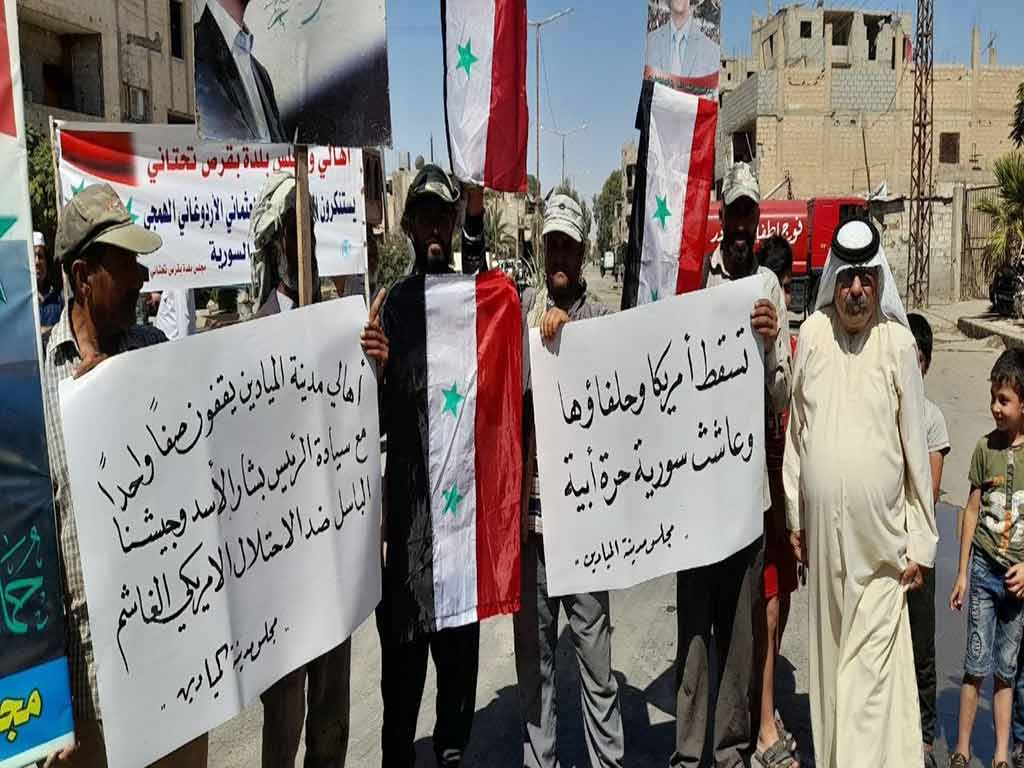 La ciudad de Al-Mayadeen en la oriental provincia siria de Deir Ezzor fue testigo de una masiva manifestación popular en rechazo y condena a la presencia militar ilegal de EEUU en esta nación levantina.
